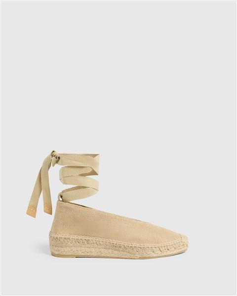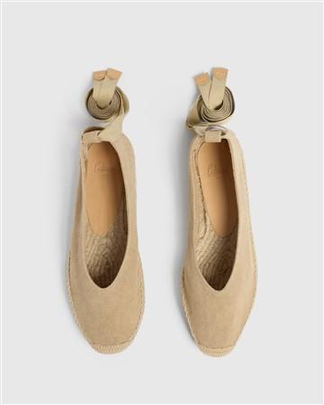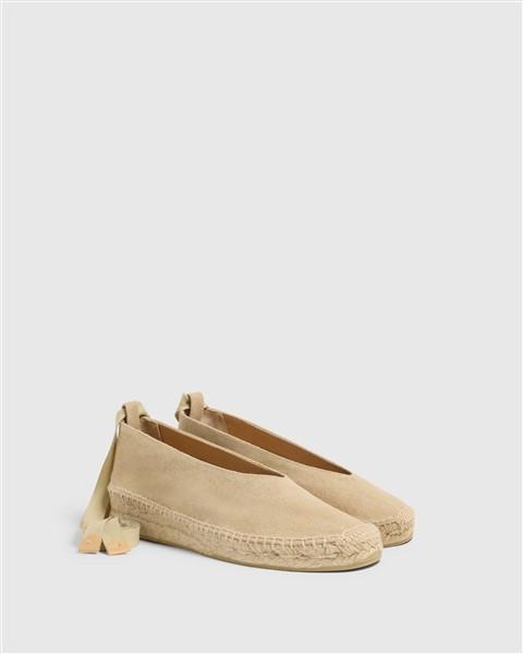Alpargata bailarina de CASTAÑER GEA/2/002 elaborada en lona de algodón en color arena.Altura de 2 cm. Diseño con pala escotada en V y cintas al tobillo, punta redonda. Suela vulcanizada de yute color natural y caucho.