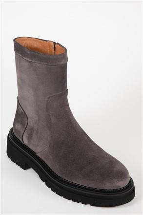 Botín de HOMERS 21986 en serraje gris Lavanda. Altura plataforma 2,50 cm, altura tacón 4,50 cm, altura real 2,00 cm. Cremallera interior, forro de piel y plantilla acolchada.