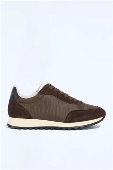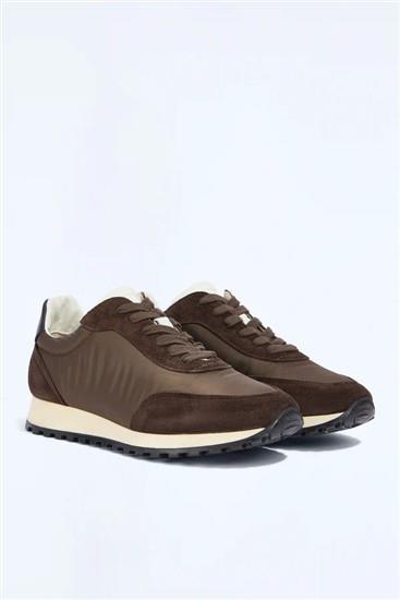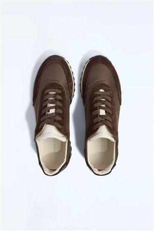 Deportiva de LIVIANA CONTI en serraje y nylon marrón. Suela autodeslizante, plantilla de piel. puntera y talón reforzados, cordones al tono y suela de goma elevada.